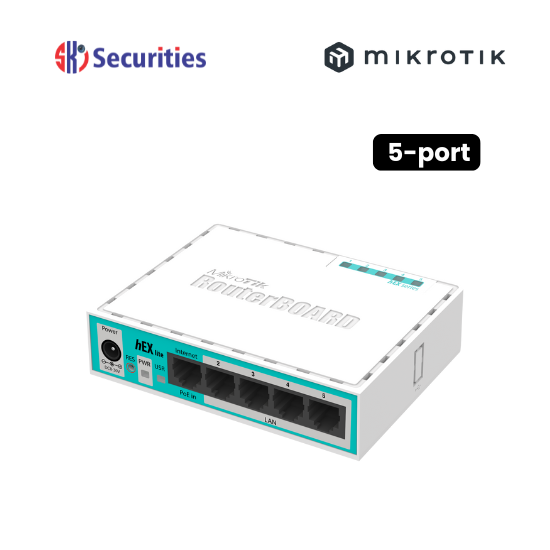 The hEX lite is a compact five-port Ethernet router housed in a sleek plastic enclosure.