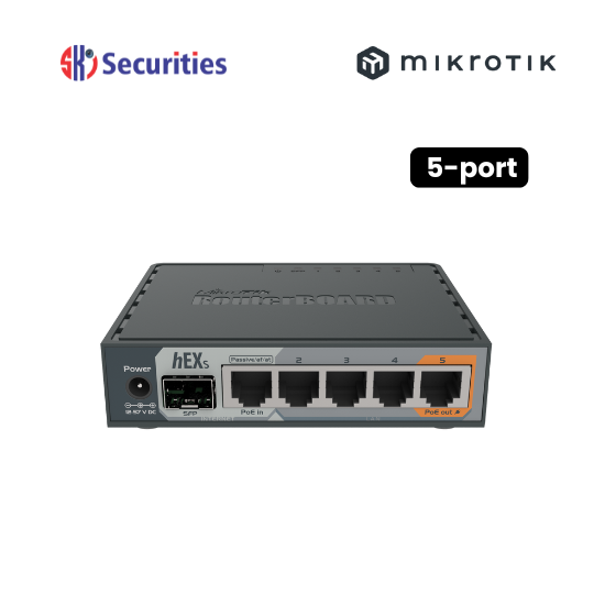 Compared to the standard hEX model, the hEX S adds an SFP port for fiber connectivity and PoE output on the fifth Ethernet port, offering increased flexibility for powering compatible devices.